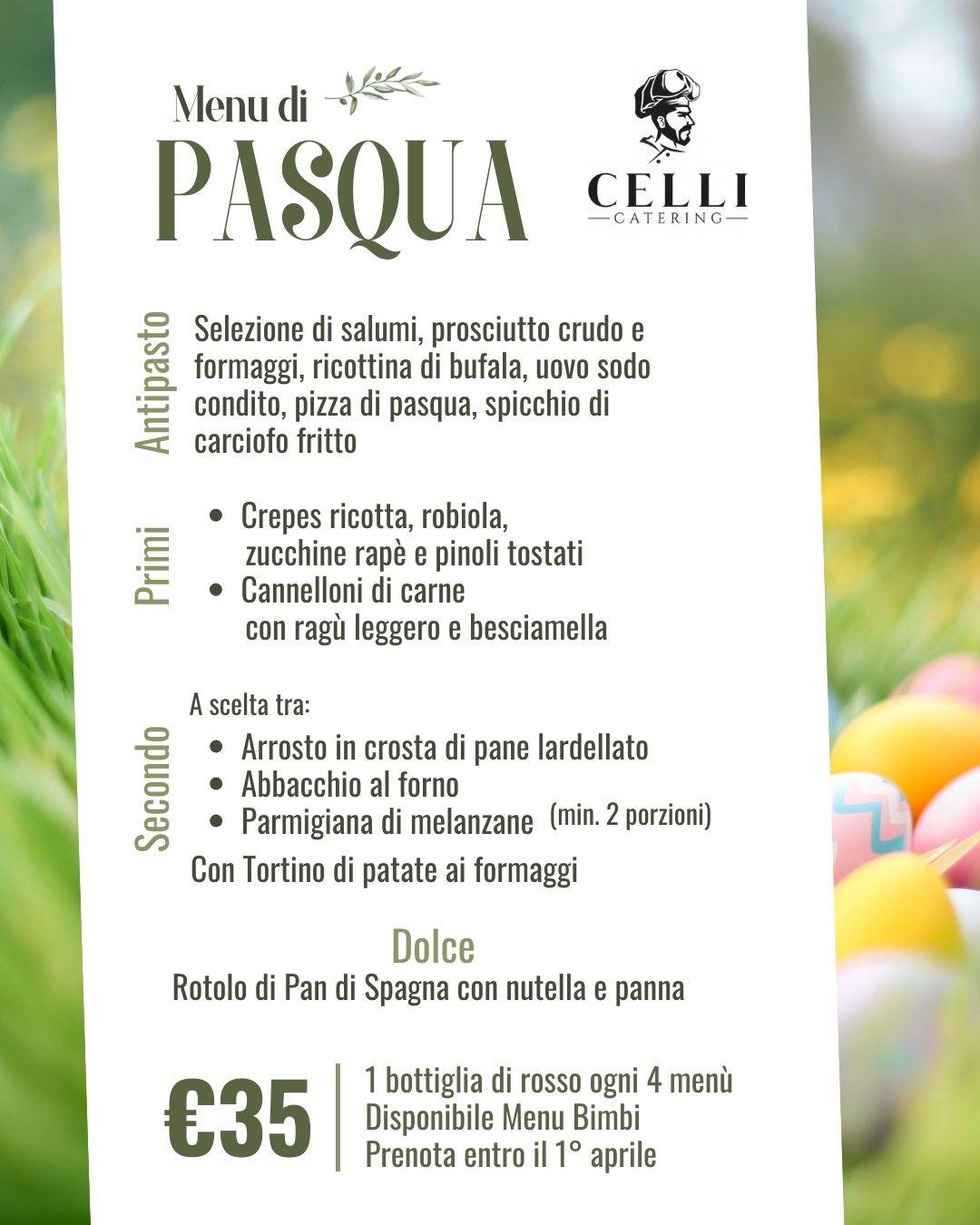 Al menù di Pasqua quest’anno ci pensa Marco! Pensiamo noi a tutto — i piatti arrivano pronti, da scaldare in forno e portare direttamente in tavola.